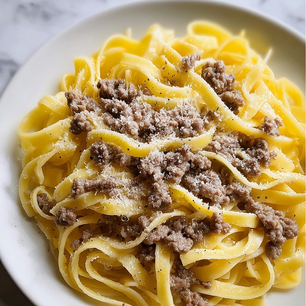 Cheesy Garlic Butter Linguine Pasta with Savory Ground Beef Recipe - Recipe Image