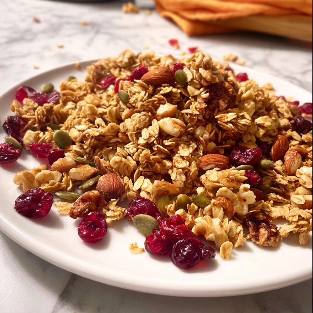 This festive Christmas Granola recipe combines toasted rolled oats, crunchy nuts, and sweet dried cranberries, all coated in a warm blend of honey, coconut oil, and aromatic spices. Perfect for a joyful seasonal breakfast or snack, this granola is baked to golden perfection and easy to customize with your favorite nuts and dried fruits.