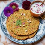 This thalipeeth pairs wonderfully with cooling yogurt-based dips, such as makhana fruit shrikhand, and tangy, vibrant chutneys like roasted tomato chutney. These sides contrast perfectly with the crispness and spice in the thalipeeth, making every bite a flavorful adventure.