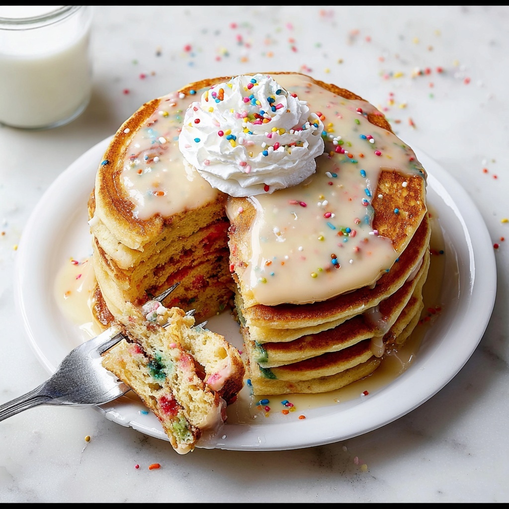 - Serve: Repeat with the remaining batter, keeping finished pancakes warm in a 200°F oven if desired. Serve the pancakes warm topped with whipped cream, additional sprinkles, or maple syrup for a delightful treat.
