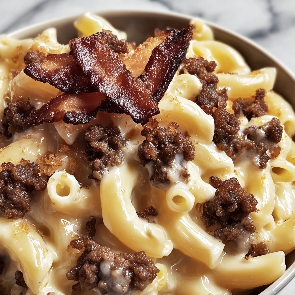 A decadent and comforting Loaded Bacon Cheeseburger Alfredo Pasta combining hearty ground beef, crispy bacon, and creamy cheese sauce with tender pasta for a quick and satisfying meal.