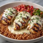 - Finish and Serve: Pour the creamy cheese sauce evenly over the baked chicken breasts. Garnish with fresh cilantro or parsley and add optional toppings like sliced jalapeños or diced tomatoes for extra flavor and texture. Serve warm alongside rice, tortillas, or your favorite vegetables.