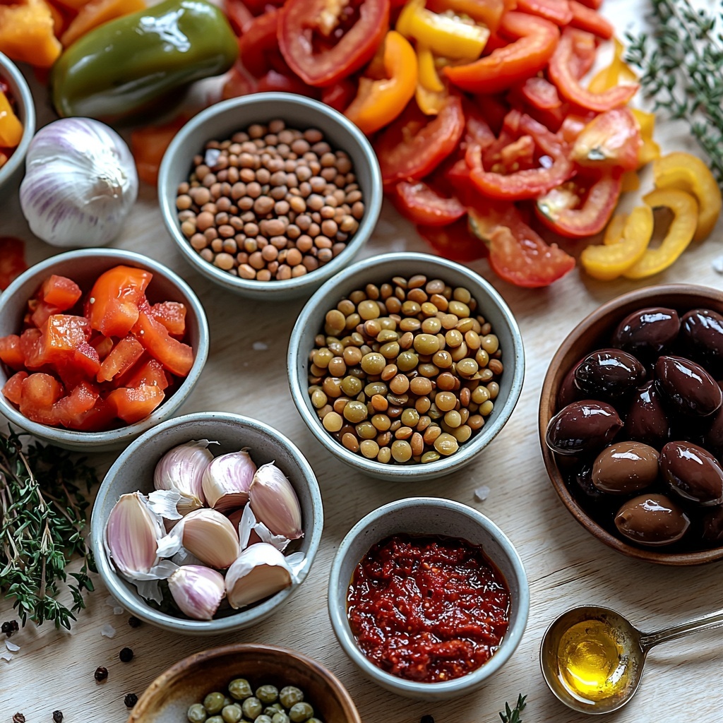 - Add lentils and seasonings: Stir in the drained lentils, canned chopped tomatoes, tomato paste, sliced olives, and capers. Season the mixture with smoked paprika, dried Italian herbs, dried thyme, salt, and pepper. Mix everything thoroughly so all ingredients are evenly coated with the spices and tomato base.