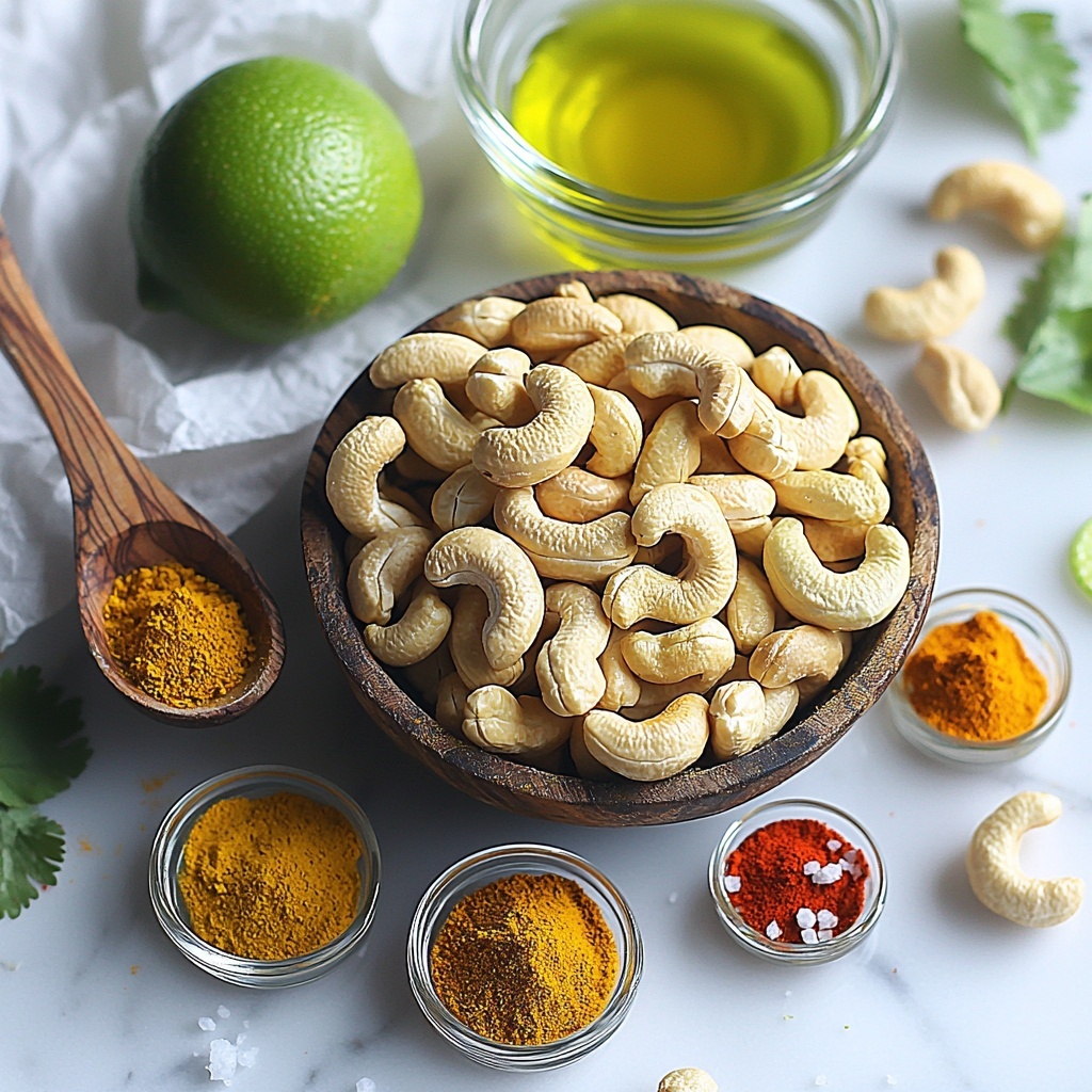 These ingredients are wonderfully simple yet essential to achieving the perfect balance of flavor, texture, and color in this Savory Curried Cashews Recipe. Each one plays an important role — from the rich crunch of raw cashews to the aromatic spices and the zing of fresh lime that wakes up your palate.