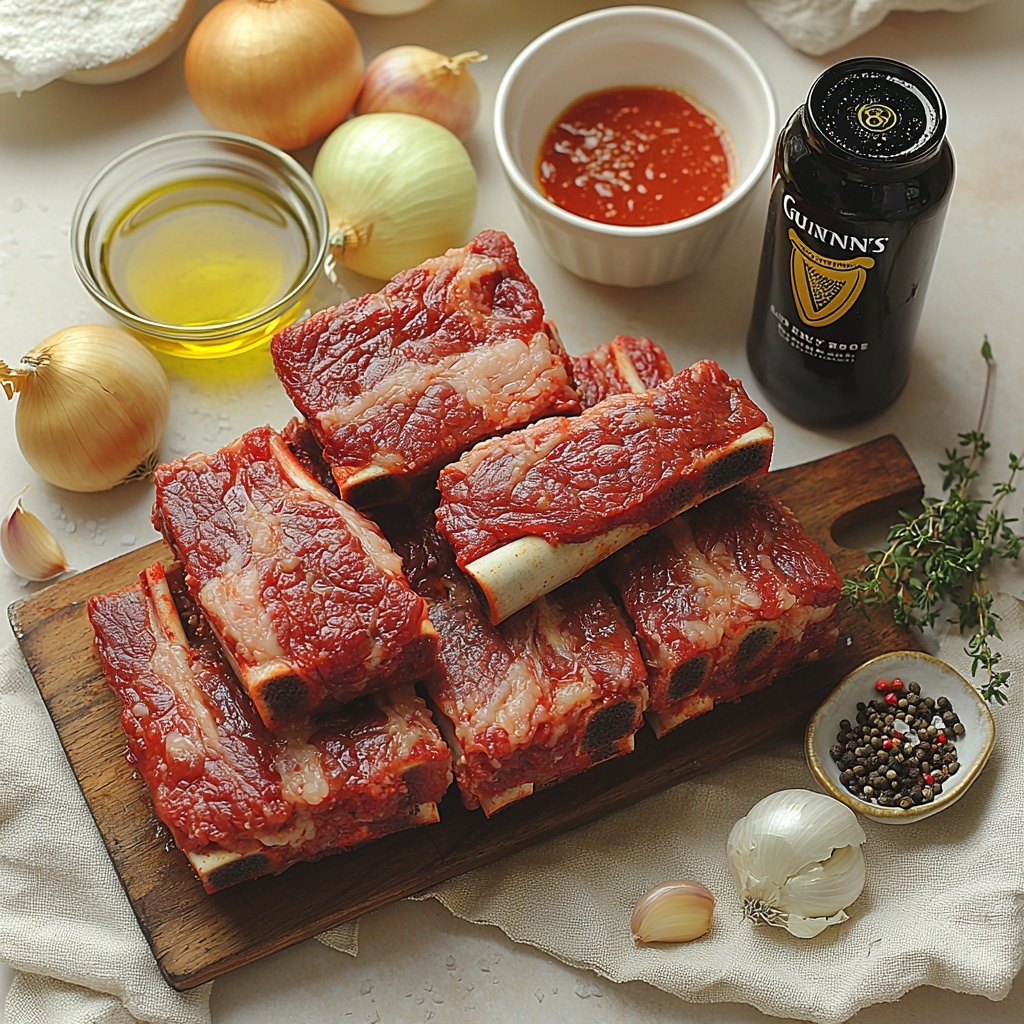 Gathering the right ingredients is the first step toward creating these melt-in-your-mouth short ribs. Each ingredient is thoughtfully chosen to build depth and texture — from the bone-in beef short ribs that provide richness, to the Guinness beer which imparts a beautiful malty complexity.