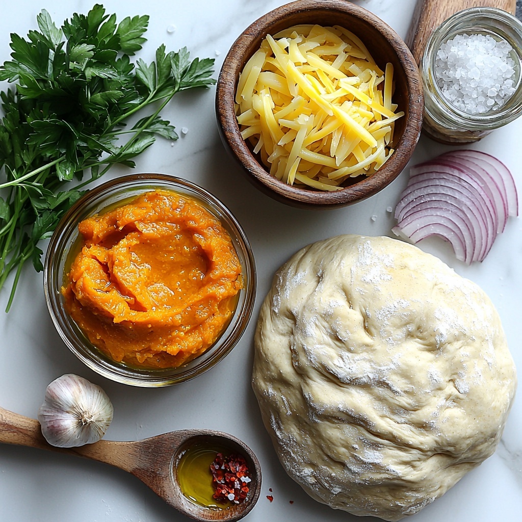 - Add Toppings: Evenly distribute the caramelized onion and garlic mixture over the pumpkin layer, then sprinkle freshly grated gouda cheese on top.