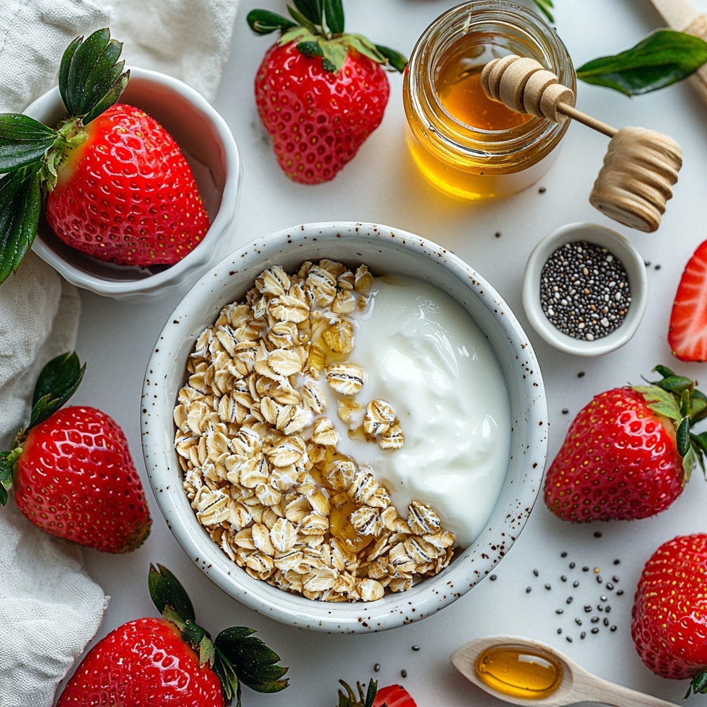 1. Gather Ingredients: Collect all the required ingredients including rolled oats, almond milk, Greek yogurt, honey, chia seeds, vanilla extract, and fresh strawberries.