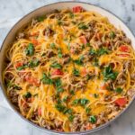 A flavorful and easy Taco Spaghetti recipe that combines the zest of taco seasoning with the comfort of spaghetti for a quick weeknight dinner. Ground beef is browned with onions, then simmered with Rotel tomatoes, spaghetti noodles, and seasonings, finished with melted cheddar cheese and fresh cilantro for a delicious fusion dish.